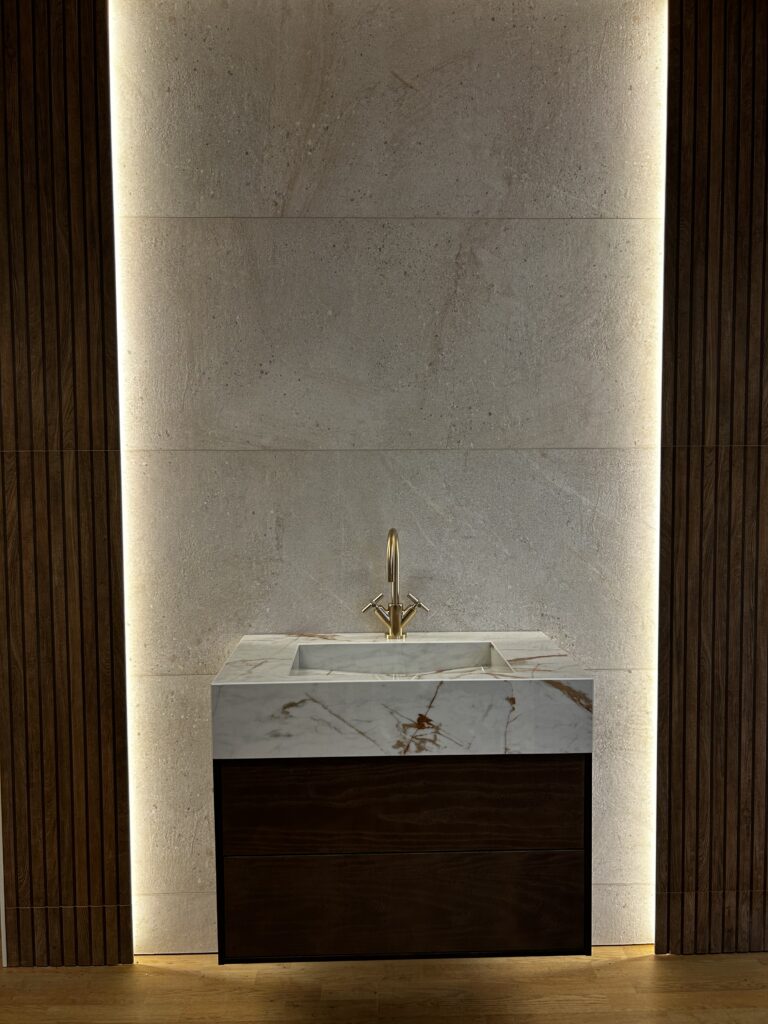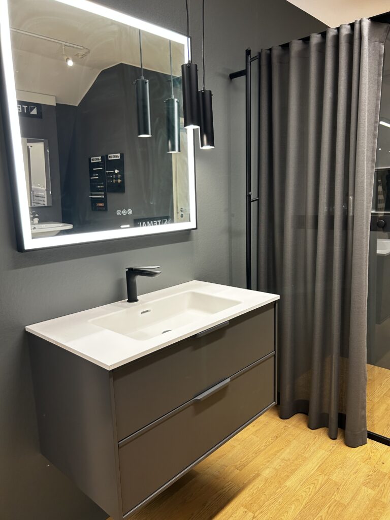 Vi har en stor utställning centralt i Söderköping där vi visar upp ett brett sortiment av badrumsmöbler, kakel och klinkers. Vill du besöka oss behöver du först boka en tid så möter vi upp dig i vårt showroom.